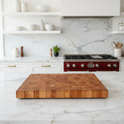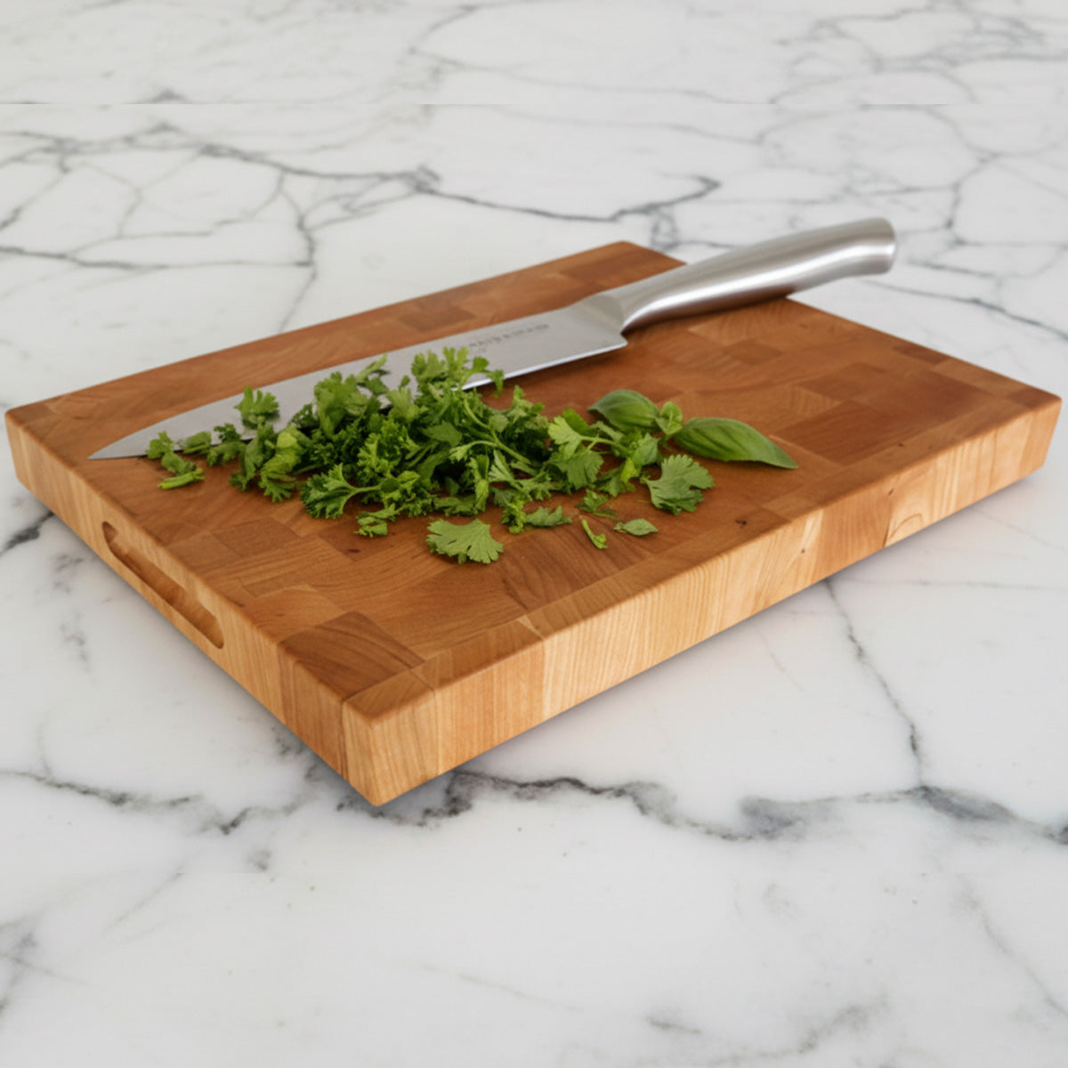 Cherry End Grain Construction – This distinctive mosaic of end grain blocks, creating a self-healing surface that’s gentle on knives while offering superior durability. The random grain orientation helps hide cut marks and extends the board’s lifespan.