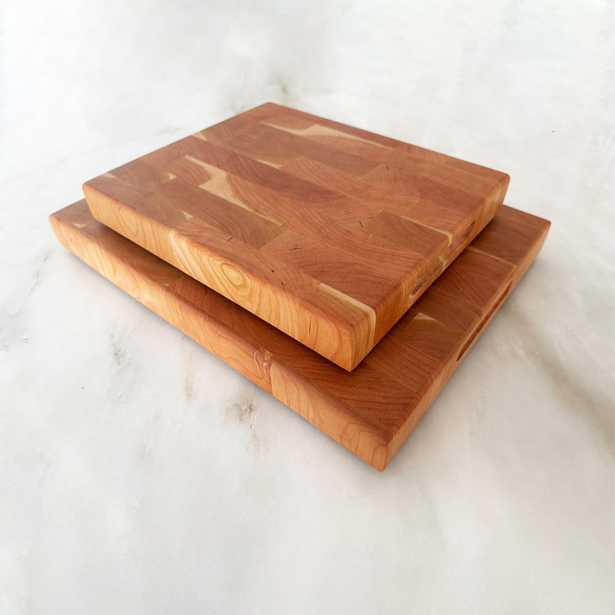 End grain cutting boards are softer on your knives and don't show scratches as easily. They are distinctive, often in a checkerboard pattern.