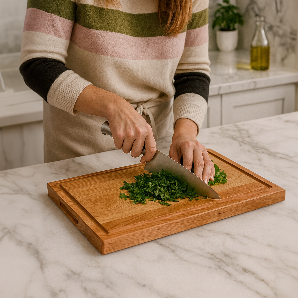 We recommend using our Deer Park Board Butter, a combination of mineral oil and beeswax, after each use for the first month. Over time, your knives will leave marks—this is normal. To remove them, a light sanding with 220 grit or finer sandpaper is all that’s needed.