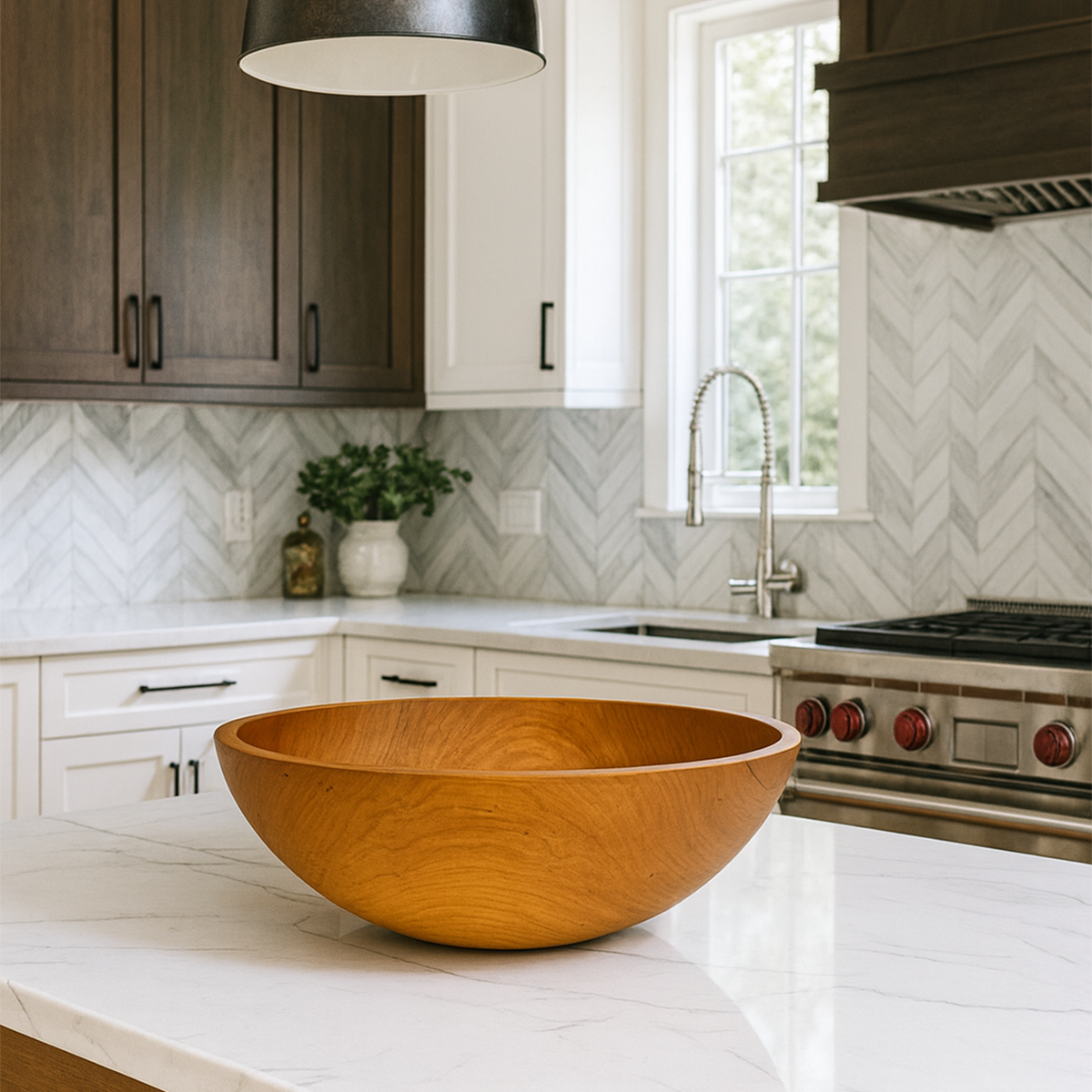 The Cherry Salad Bowl is a must-have for entertaining and everyday dining. Crafted from warm, rich cherry wood with a natural figure that makes every bowl unique, this piece is as beautiful as it is functional. Hand-turned and finished with food-safe oil, it’s designed to last for generations while bringing elegance to your table.