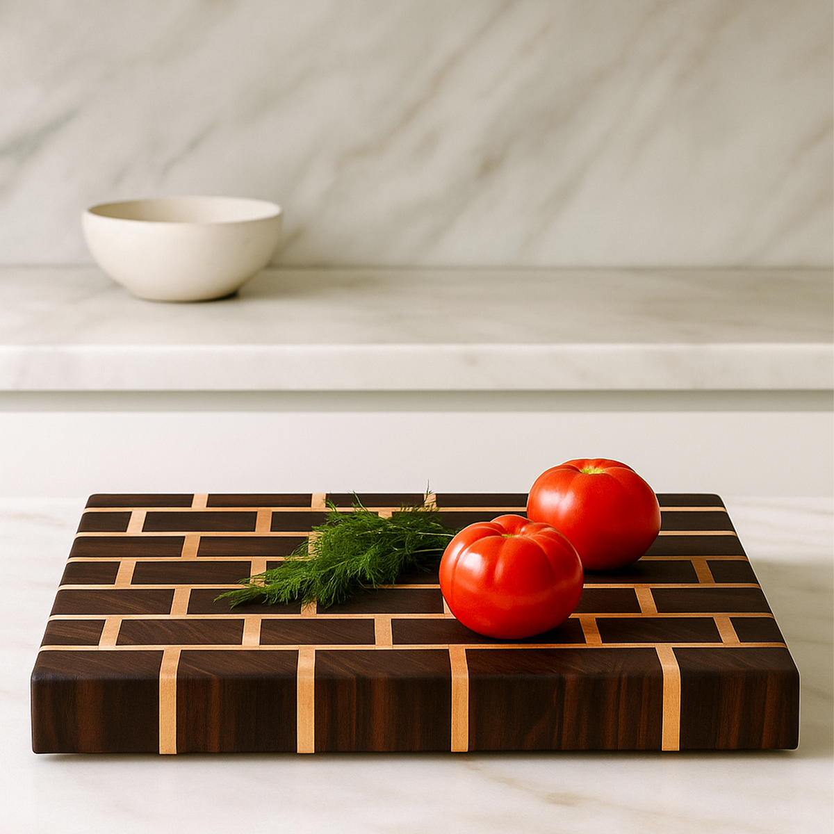 Expertly crafted from walnut and maple, "The Ossington" brick cutting board combines functionality with distinctive design. The contrasting wood tones create an elegant pattern while providing a durable cutting surface. Each board is meticulously finished to highlight the natural grain patterns, making it both a practical kitchen tool and an artisanal showpiece for your culinary space.