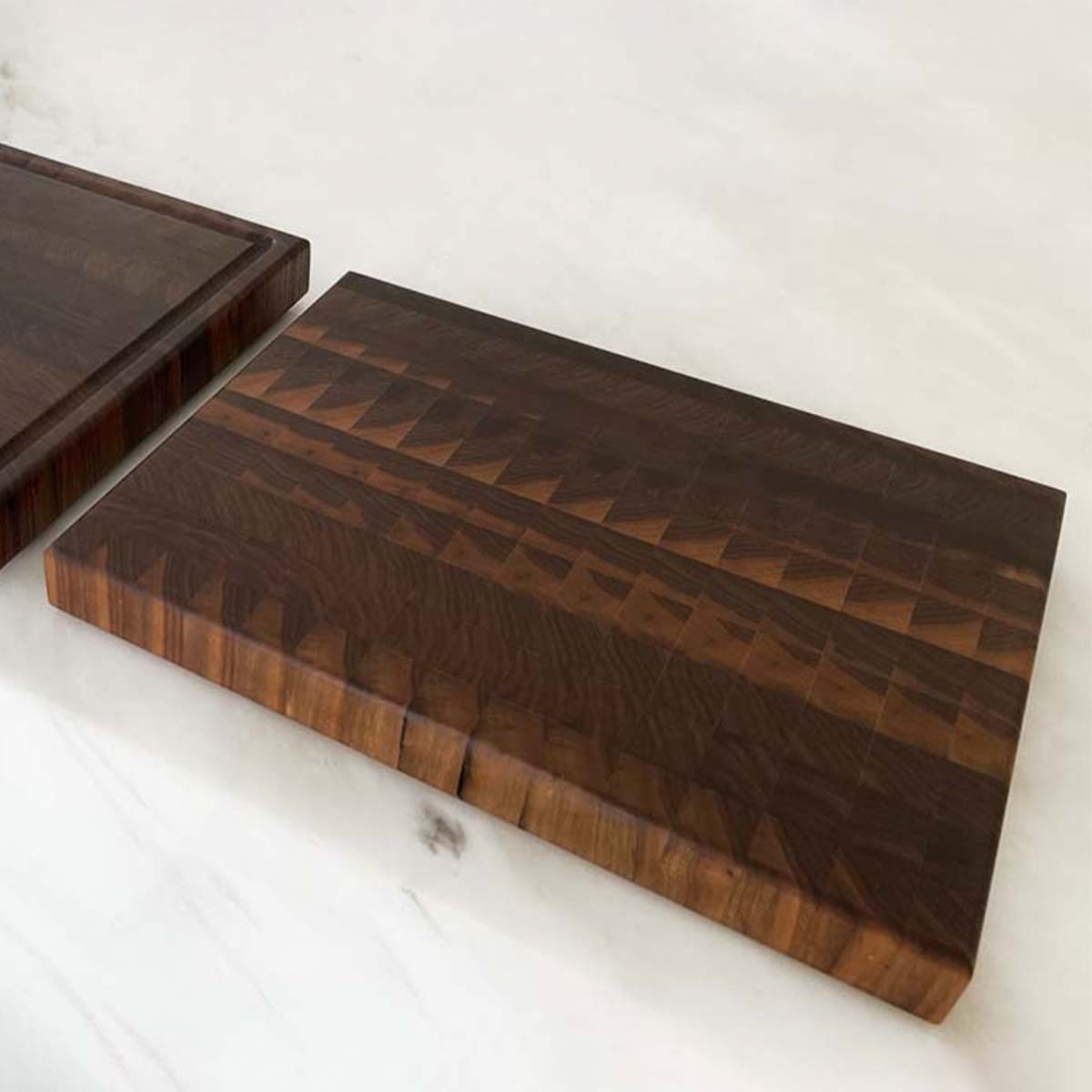 End grain cutting boards are softer on your knives and don't show scratches as easily. They are distinctive, often in a checkerboard pattern.