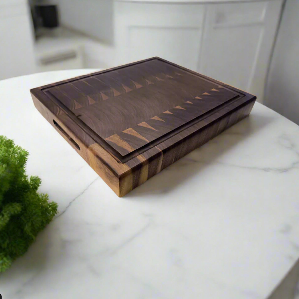 "The Hawthorne" walnut end grain butcher block is the perfect addition to any kitchen. Crafted from luxurious walnut wood with an elegant arrowhead pattern, this butcher block offers both style and functionality. It's the ideal size for a smaller countertop, allowing you to easily chop, slice, and dice all your favourite ingredients like a true chopping king.