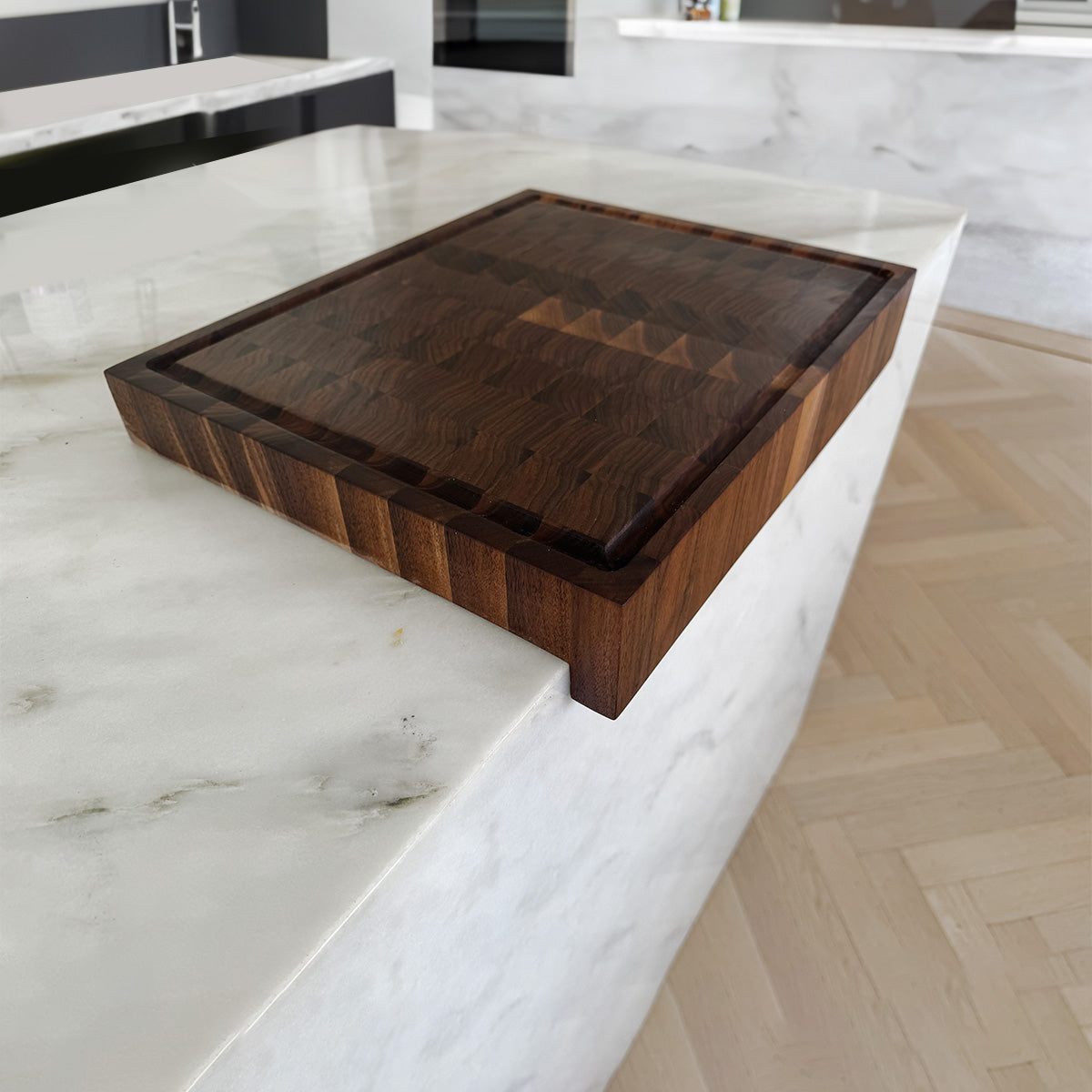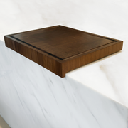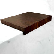 Our best selling Walnut End Grain Cutting Board "The Hawthorne" now comes in a waterfall design. Unlike our other Over-The-Counter Boards with a magnetic slider bar this board features a fixed apron.