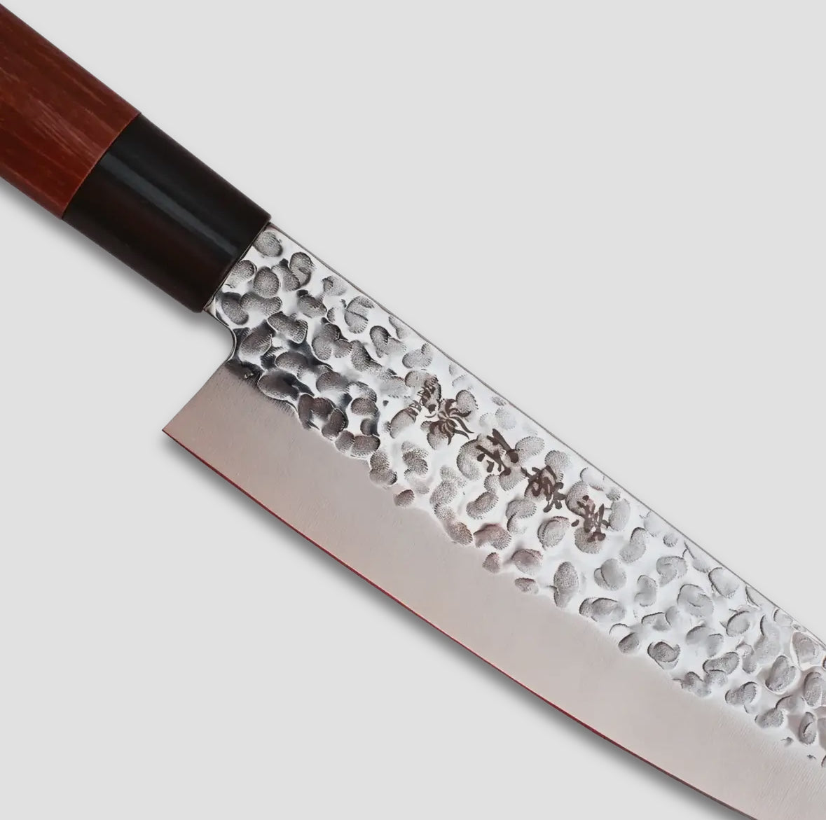 The Santoku Knife represents authentic Japanese blade-making at its finest. Forged in Japan with meticulous attention to detail, this knife features a striking hammered pattern across its DSR-1K6 high carbon stainless steel blade. This premium steel composition ensures superior edge sharpness, excellent edge retention, and reliable corrosion resistance. The hammered surface minimizes drag and prevents food from sticking during precise cutting tasks. Perfect for vegetables, proteins, and delicate ingredients, the santoku's shorter, wider blade offers exceptional control and versatility for both professional and home cooks seeking traditional Japanese quality.