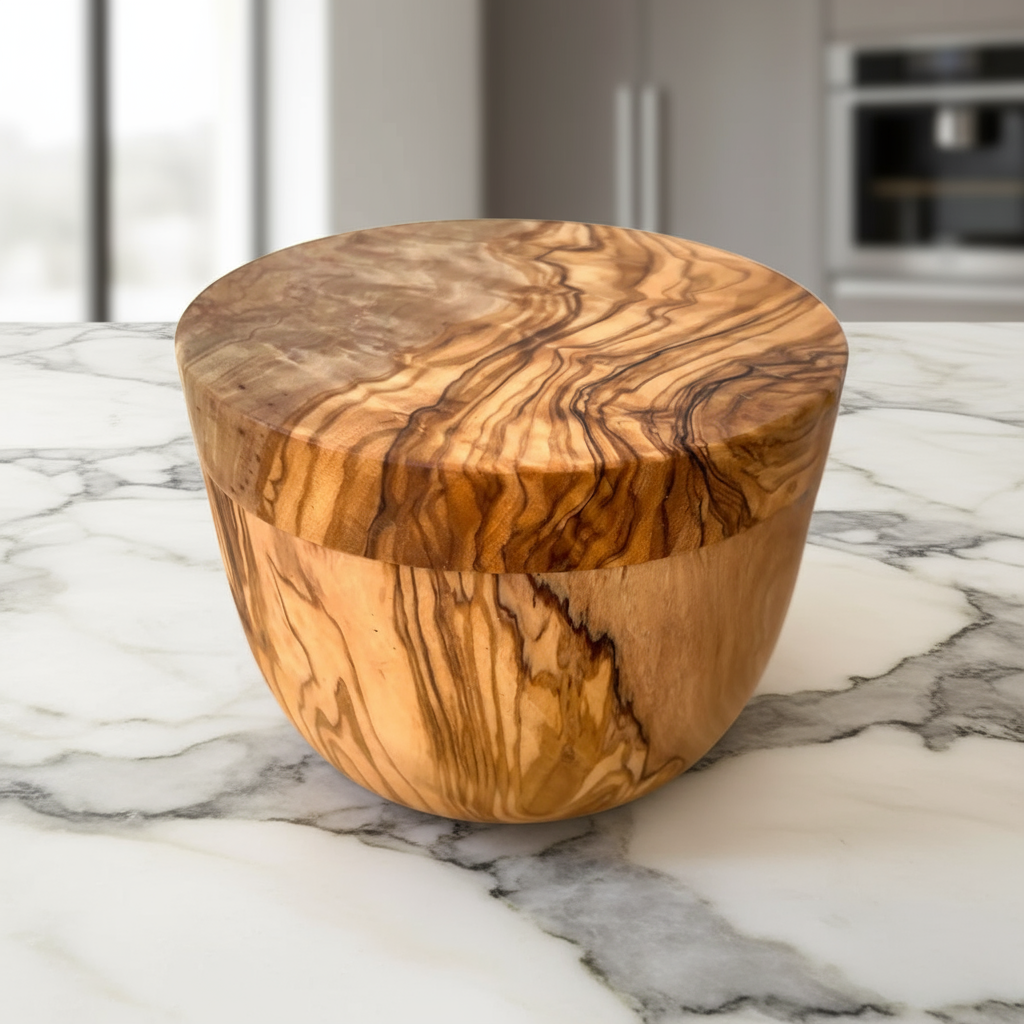 Introducing the Olive Wood Salt Cellar - a classic salt keeper made of smooth olive wood that adds charm to any kitchen decor. Our salt cellar is perfect for holding salt, pepper, and all your favourite spices - and it makes a great gift too!