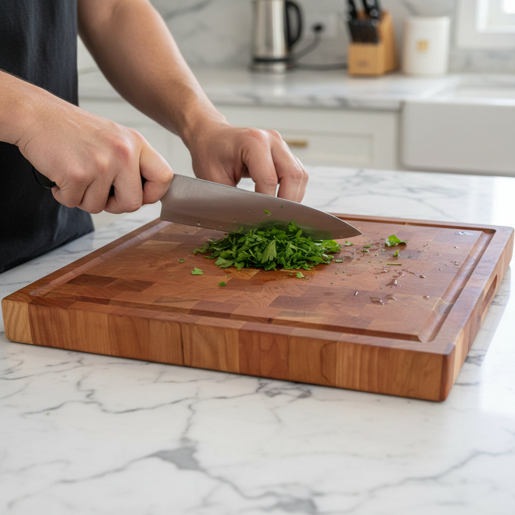 Elevate your cooking experience with The Lawton, a handcrafted cherry end grain cutting board designed for performance and beauty. Built to last, its end grain construction resists knife marks, keeps blades sharper for longer, and delivers exceptional durability. The warm cherry wood tones bring a bright, natural elegance to any kitchen countertop, making it both a practical tool and a stunning serving piece.