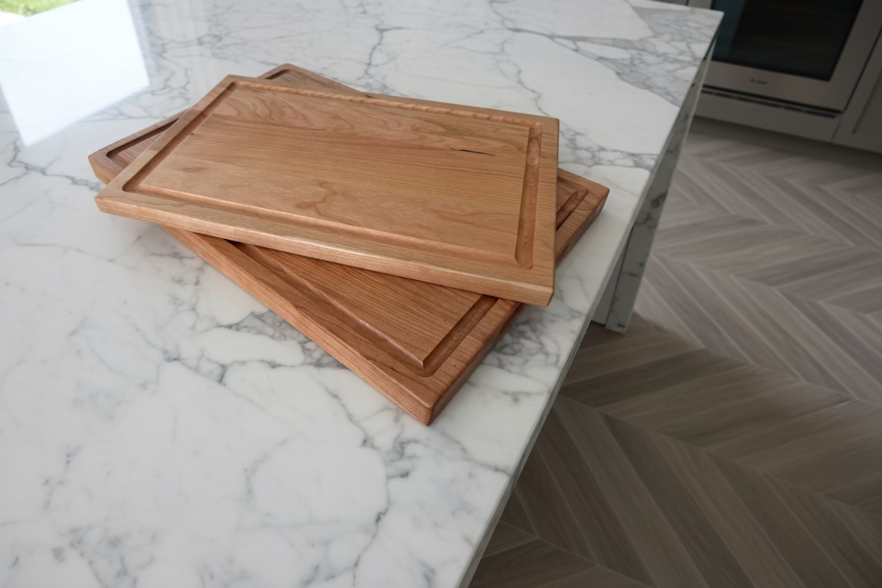 Elevate your kitchen with this versatile two-piece cherry edge grain set. The larger board (18" x 12" x 1.25") handles substantial prep work and entertaining, while the compact companion (16" x 10.5" x 0.75") suits daily tasks and serving. Cherry wood's natural beauty and durability make these boards as functional as they are visually striking. Hand-finished for a refined appearance, they're built to become kitchen staples that improve with age and use.